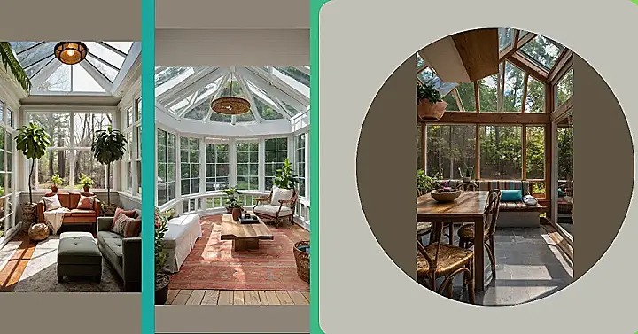 Imagine this: You’re chilling in a super comfy sunroom, sunlight streaming in through a glass ceiling like a giant, beautiful skylight! It’s basically a room made of windows, so you get all the best parts of being outside—fresh air and sunshine—without getting sunburnt or dealing with pesky bugs. Plus, this room is seriously stylish—like something straight out of a magazine. It’s got that modern farmhouse vibe, with cozy furniture and a rug that looks super soft. It’s the perfect place to relax with a good book and a glass of lemonade (or maybe hot cocoa if it’s a little chilly!).