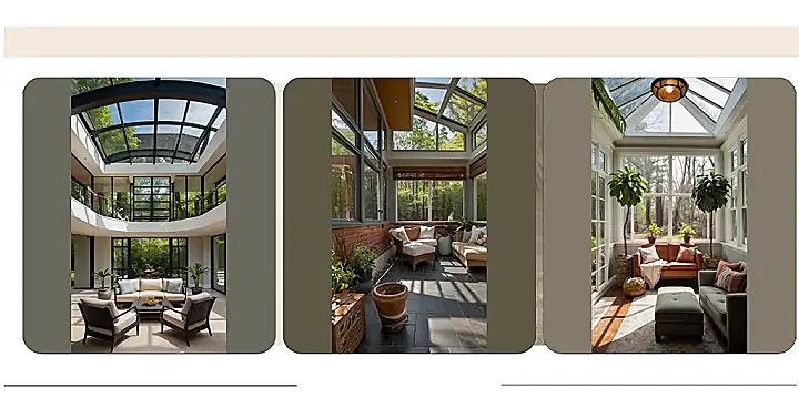Imagine this: You’re chilling in a super comfy sunroom, sunlight streaming in through a glass ceiling like a giant, beautiful skylight! It’s basically a room made of windows, so you get all the best parts of being outside—fresh air and sunshine—without getting sunburnt or dealing with pesky bugs. Plus, this room is seriously stylish—like something straight out of a magazine. It’s got that modern farmhouse vibe, with cozy furniture and a rug that looks super soft. It’s the perfect place to relax with a good book and a glass of lemonade (or maybe hot cocoa if it’s a little chilly!).
