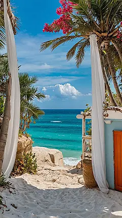 Staring at this picture is basically getting a postcard from the universe saying, “Wish you were here… seriously, stop whatever you’re doing and find a beach!” That water is so ridiculously blue and clear it looks like something you’d only see in a video game, and don’t even get me started on the perfectly fluffy cloud just hanging out like it owns the sky. This whole setup, from the silky curtains blowing slightly to the vibrant pink flowers on the palm, is screaming ‘epic vacation goals’ and giving us all the best beach inspo for future adventures (or at least daydreaming during class).