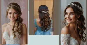 Getting ready for a wedding, especially if you’re the one getting married, probably feels like trying on a million sparkly things while your hair refuses to cooperate. But just look at this awesome hairstyle with that cool tiara! It’s like someone waved a magic wand and said, “Poof! Instant princess ready for sunshine.” This kind of half-up, half-down style with flowing curls is total hair goals if you want to look fancy without feeling like your head is glued solid with hairspray all day.