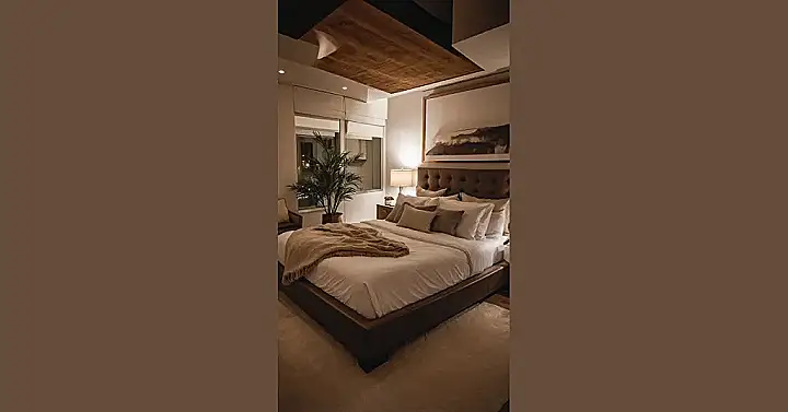 Step into this super-luxe bedroom, where comfort is clearly king! With its giant, cloud-like bed stacked with enough pillows to build a fort, and those super soft-looking blankets in shades of warm caramel and gold, it’s practically begging you to dive in for a nap. The wood-paneled walls and chic artwork give it a grown-up vibe, and those fresh white roses on the nightstand are totally setting a romantic mood. You’d think this place would be totally ready for some ‘romantic bedroom rose petals decor,’ right? Well, someone must have forgotten to sprinkle them, because this gorgeous room is rocking a petal-free zone – maybe they’re still in the bag, waiting for the perfect dramatic moment!