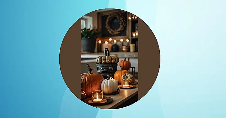 This picture is like a cozy fall hug, but without all the crazy orange and yellow that can be overwhelming. It’s got pumpkins, but they’re not shouting “Halloween!” at you. It’s like a fancy, grown-up fall vibe, kind of like the feeling of walking through a pumpkin patch without getting your shoes muddy.