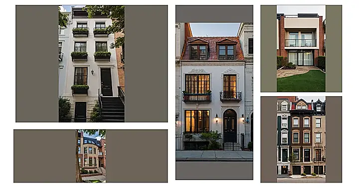 These townhouses are like a delicious layer cake ‚Äì each one a different flavor! You’ve got your dark chocolate (that’s the deep brown one!), your creamy vanilla (the light beige one), and even a hint of red velvet on top (check out that roof!). They all stand together, side-by-side, creating a beautiful, charming street scene. Imagine living in one of these, maybe baking cookies and watching the world go by from your window, or inviting friends over for a movie night ‚Äì the perfect blend of stylish living and cozy comfort.