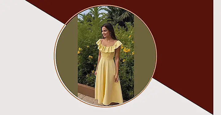 Who knew a dress could look so delicious? This butter yellow beauty, sported by our smiling model, is basically sunshine in fabric form. It’s got that super cute ruffled neckline, making it look light and breezy – perfect for twirling through a garden, or just pretending you are! The shade is so spot-on, it makes the surrounding green plants look even greener, like they’re trying to show off with her. She clearly mastered the art of looking effortlessly joyful, making this dress a total mood booster.