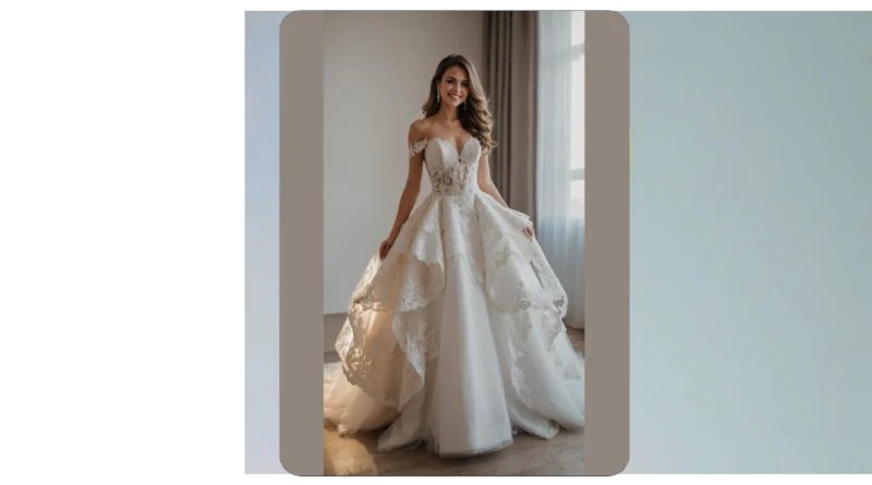 The woman in this picture looks absolutely radiant, rocking a dress that basically screams, “I woke up like this, now bow down!” Seriously, this isn’t just a dress; it’s a full-on fairy tale explosion of lace and elegance. With all those layers of gorgeous fabric and that fabulous off-the-shoulder look, you could totally picture her stepping out of a royal carriage, ready to greet her adoring subjects. She’s not just walking; she’s probably floating on a cloud of pure dreams, making everyone wonder if they accidentally stumbled into a real-life royal wedding scene straight out of a movie.