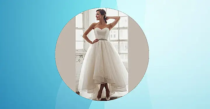 This dress is like something straight out of a princess movie, but way cooler! It’s got that classic bridal look with the sweetheart neckline and flowing skirt, but the high-low hemline adds a modern twist that’s totally unexpected. Imagine twirling on the dance floor—this dress would be a total showstopper. Plus, the sparkly belt is the perfect finishing touch; it’s like a subtle sparkle that says “I’m getting married and feeling amazing!”