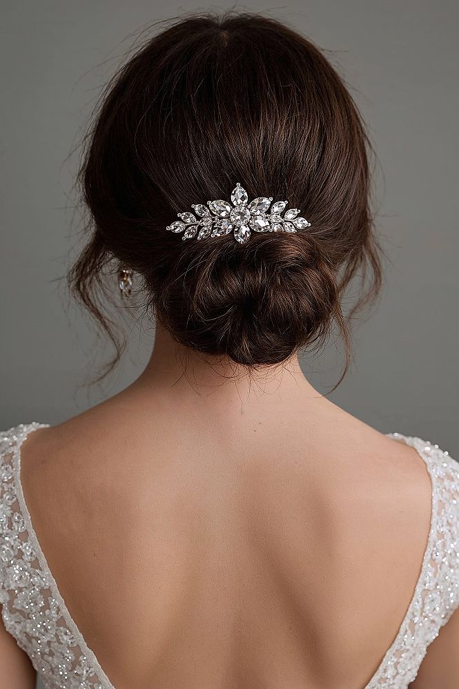 Discover refined bridal style with this elegant wedding hair up, featuring a meticulously crafted low bun. The sophisticated silhouette is enhanced by a dazzling crystal hair comb, adding a touch of glamour.