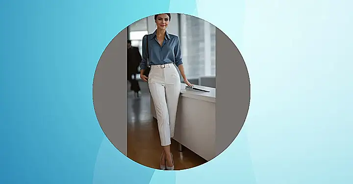 So how do you get that look without raiding your grandma’s closet? It’s easier than you think! Start with some killer high-waisted trousers like the white ones shown, they make your legs look miles long and instantly feel fancy. Then grab a simple, chic top in a classic colour, add some cool but not *too* flashy earrings, and boom – instant corporate glow-up achieved. It’s like putting together a puzzle, but the end result is you looking like you’re ready to slay presentations instead of just surviving Monday.