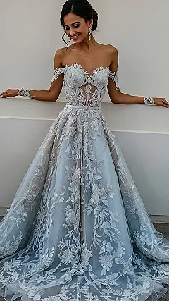 Forget boring old white! This stunning wedding dress proves that colored wedding dresses are where it’s at. Look at that gorgeous light blue – it’s like something out of a dreamy fairytale, right? All that beautiful lace and the amazing off-the-shoulder design? It’s enough to make anyone want to say “I do” (even if you’re only pretending for a super fun photo shoot!). It’s like a princess’s dress that’s been sprinkled with fairy dust and wishes!