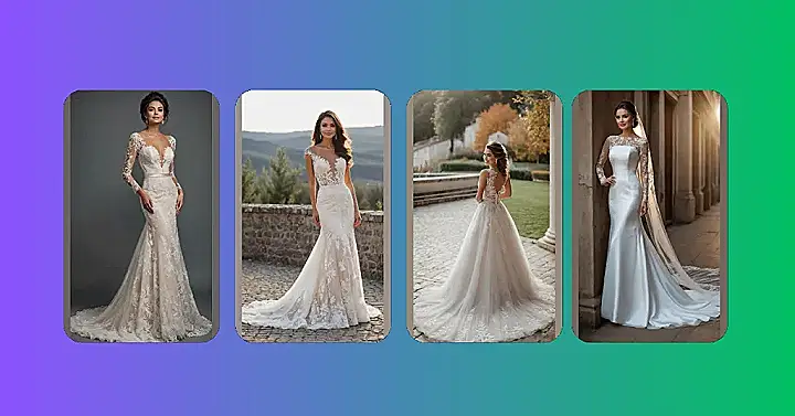 Get a load of this wedding dress! It’s got that famous “trumpet” shape, which basically means it’s super fitted until about the knee, and then BAM – it flares out dramatically like the bell of a trumpet. This style is definitely for someone who wants to make a grand entrance, maybe even requiring a red carpet and a slow-motion walk, because you’re practically floating on air. With those delicate lace sleeves and the way the silky fabric catches the light, it looks like this bride could easily be off to star in her own rom-com or, at the very least, command attention at the snack table.
