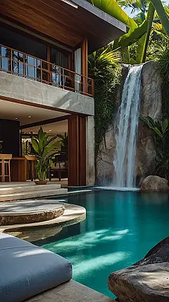 This isn’t your grandma’s vacation house! Picture this: you’re lounging by a sparkling infinity pool, the turquoise water so clear you can almost see tiny fish swimming. But wait, there’s more! A real-life waterfall tumbles right into your pool, like something out of a tropical fantasy movie. This luxury villa is pure bliss – think lazy days swimming, sunbathing, and maybe even pretending you’re a mermaid or something equally awesome. Who needs a beach when you have your own personal waterfall spa?