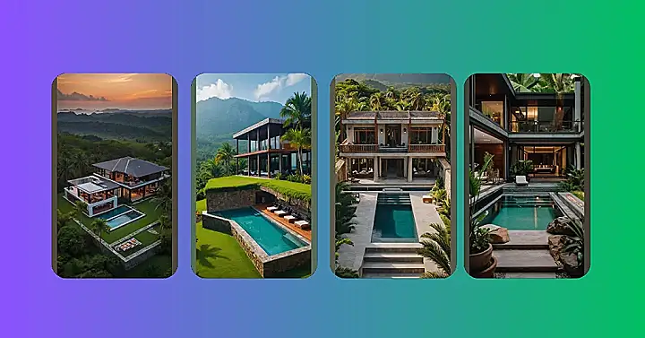 Imagine this: you’re chilling by a sparkling pool, the sun dipping below the horizon, painting the sky in amazing colours. This isn’t just any house; it’s a luxurious tropical villa, straight out of a dream! The picture shows a modern, super-stylish place with huge windows that let you soak in all the stunning views. It’s like the house itself is saying, “Relax! You deserve it!” With its sleek design and comfy-looking furniture, this place is perfect for a super relaxing vacation, whether you’re hanging out with friends or having some quality family time.