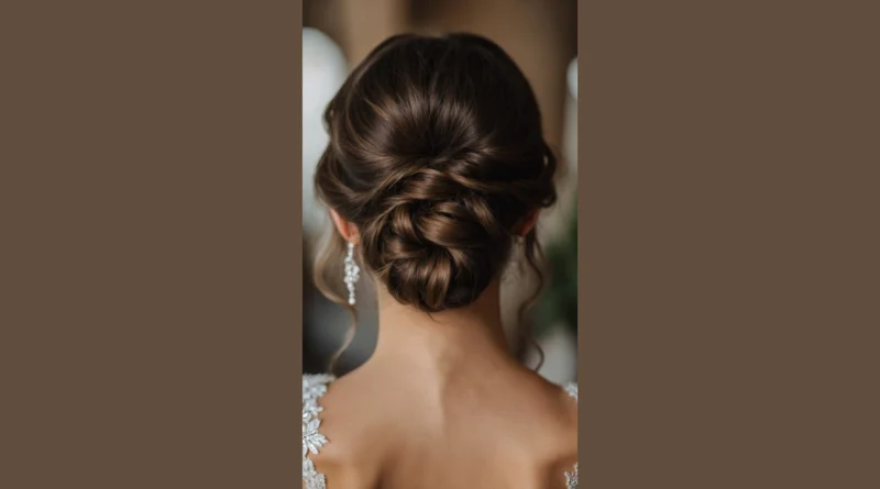 Check out this hair masterpiece! This amazing updo isn’t just a hairstyle; it’s practically a work of art, looking totally ready for a fancy wedding or, you know, just gracefully accepting a bouquet toss. This classic bun in the picture is perfect for looking super elegant without your hair getting in the way when you’re busy laughing at terrible dad jokes during the reception. Plus, it shows off those sparkly earrings and fancy dress details, making you look like a total queen without having to worry if your hair is cooperating.