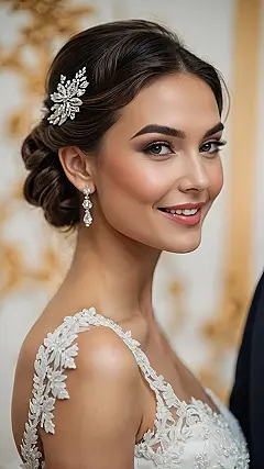 Just look at this hair, serving major wedding vibes without even trying! This isn’t just any old bun; it’s a ‘classic updo’ that basically took a master’s degree in elegance and then decided to major in sparkle. All those intricate twists and turns make it look like your hair just rolled out of a fairytale, even if your actual morning involved tripping over your cat. And that dazzling hairpiece? It’s like a tiny, shiny constellation decided to land right on your head, making sure you look absolutely radiant from every angle – no dull hair moments allowed!