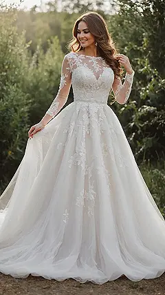 This dress looks like it stepped right out of a movie, totally nailing that romantic wedding dress vibe! With all that beautiful lace detailing on the top and a skirt that flows like a dream, you could practically float down the aisle. It’s the kind of dress that makes you want to twirl around just because you can, probably causing a minor breeze and maybe knocking over a distant relative’s champagne flute, but hey, it’s worth it for the dramatic effect!