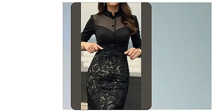 This dress is like a super stylish secret agent: all sleek and sophisticated on the outside, with a hint of “wow” underneath! The sheer top is like a peek-a-boo game, showing just enough to keep things interesting without being too much. It’s totally mysterious and modern, and you’ll feel like a total boss wearing it. Imagine pairing it with some killer heels and sparkly earrings – instant party ready!