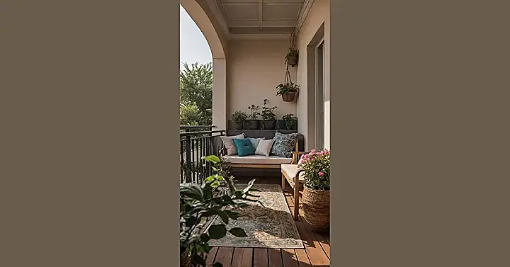 Look at this place! It’s like your plain old balcony went through a serious upgrade montage and emerged looking like a cozy outdoor living room. Forget cramming onto a tiny chair; this spot has fluffy cushions practically begging you to sink in and forget about homework. With all those plants hanging around and lining the ledge, it feels less like you’re just outside your room and more like you’ve found a secret garden just for chilling. It’s definitely not your grandma’s dusty balcony.