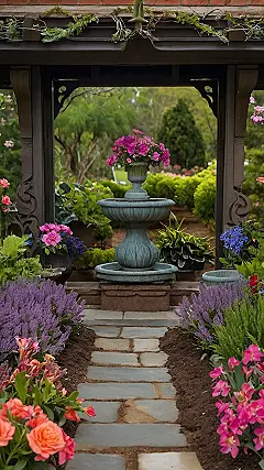 This enchanting flower garden is like stepping into a storybook! Imagine tiny fairies flitting around that adorable little fountain, maybe even taking a sip of water before zipping off to sprinkle magic dust on the vibrant blooms. The path looks like it’s made of giant, comfy stepping stones, perfect for a leisurely stroll – just watch out for mischievous garden gnomes who might try to trip you up!