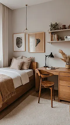 And talk about making the most of your space! Those layered wooden shelves are basically a genius move, turning wall space into prime real estate for showing off your personality – whether that’s with a collection of artsy frames, a tiny plant jungle, or even a super cool mirror for checking your outfit. Plus, with those sleek hanging lights on either side of the bed, you get perfect mood lighting for chilling without needing a clunky lamp. This room proves that even if your space is just for one, it can still have big style and all the cozy vibes you could ever wish for!