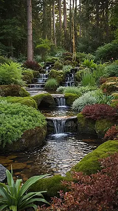 Stepping into this forest garden feels less like a place you planted and more like you accidentally found where nature hides its most awesome stuff. You’ve got waterfalls doing their bubbly staircase impression, tumbling down mossy rocks that look like comfy green pillows for garden critters (or maybe just really happy rocks). It’s like the tall trees in the back decided to host a huge pool party and invited all the coolest plants they know to splash around by the water. Finding a spot this cool is like uncovering a secret level in a video game, minus the monsters… hopefully!