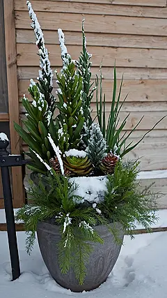 Imagine this: it’s a chilly winter day, and the snow is softly falling. You’re snuggled up inside, watching the world go by. Then, you look outside and see this beautiful planter on your front porch. It’s like a little piece of summer that’s braved the cold weather! The green plants are dusted with snow, looking like they’re wearing tiny, fluffy hats. It’s a reminder that even in the coldest months, beauty can still be found.