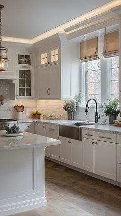 Walking into this kitchen, you’d half expect it to offer you a tiny, perfectly crafted appetizer instead of letting you just grab a snack. With those gleaming white cabinets, super fancy marble counters that sparkle, and a sink so big it could probably double as a mini-pool for rubber duckies, you might feel like your instant ramen needs a black tie. It’s the kind of place where even spilling a little juice would feel like a major fashion faux pas, making you wonder if you should get a special apron just for entering.