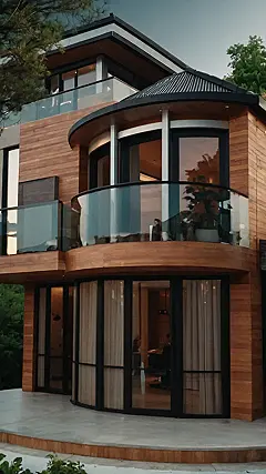 This house is like something out of a fairytale! It’s got a beautiful curved balcony, big windows that let in tons of light, and wood siding that makes it look super cozy. Imagine snuggling up on the couch on a rainy day with a good book and a cup of hot cocoa, and watching the raindrops fall outside. You could almost feel the warm and fuzzy vibes just by looking at this picture.