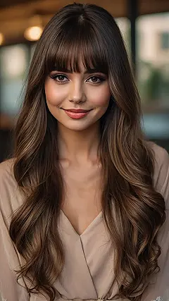 This picture just screams “good hair day,” doesn’t it? With those lush, wavy locks and perfectly styled bangs, you can practically hear the hair swishing! That gorgeous, flowing hair, especially around her face with all those dreamy layers, is basically the poster child for the famous butterfly haircut. It’s like her hair decided to level up and get its own superpower, ready to make a grand entrance wherever she goes. Forget flat hair days, this style brings the bouncy drama!