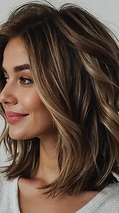 This girl is rocking a super cute mid-length bob haircut! It’s like the perfect mix of long and short hair, giving her the best of both worlds. The waves in her hair add even more volume and style, making her look like she just stepped out of a magazine. You can tell she’s totally happy with her new look because she’s flashing that awesome smile, like she’s ready to conquer the world with her gorgeous mane!