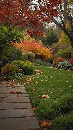 You could get lost in this garden, just wandering around and admiring all the colors. It’s like a secret world where all the plants are getting ready for a big, beautiful winter sleep. And don’t forget the green grass – it’s like a soft carpet that makes everything look even more magical!