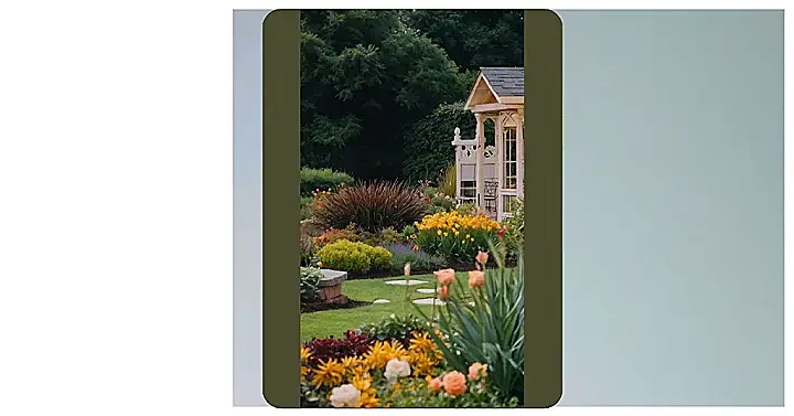 This garden is like something straight out of a storybook! Imagine yourself strolling through the lush green grass, the soft petals of delicate flowers brushing against your legs. The little white gazebo, with its fancy trim, looks like it could be home to a mischievous fairy or a wise old gnome. It’s the perfect spot for daydreaming, having a picnic, or just enjoying the beautiful scenery.