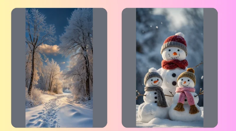 This scene is packed with so much friendly energy, you can almost feel the crisp, cool air and the soft flutter of falling snow – making it the ultimate winter wallpaper for your phone or computer. The smaller snowmen, one in a cute grey beanie and the other in a cozy pink scarf, seem to be eagerly listening, maybe plotting their escape before the sun gets too strong, or just happy to soak up the early winter sunshine. They’re a reminder that even when the days get shorter, there’s always fun to be found in the simple joy of a fresh snowfall and some goofy, bundled-up friends.