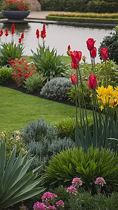 And just when you think you’ve seen all the botanical coolness, there’s a super chill pond hanging out in the background, making this whole scene even more relaxing. It’s like the garden has its own VIP section for the really tall, spiky red flowers to gaze at their reflections. This garden clearly has its life together, unlike our messy lockers! Every plant seems perfectly placed, probably sending memos to each other about color coordination. It’s definitely a spot where you could forget about homework for a bit and just soak up all that amazing flower power.