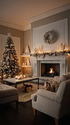 It’s amazing how a few simple decorations can make such a big impact! The miniature trees and sparkly ornaments are adorable, and the way they’re arranged around the fireplace is super clever. Even those little gifts on the table add to the festive feeling. It shows that you can make your small apartment look incredibly festive without cluttering up the place. Plus, those shiny baubles scattered on the fluffy rug really complete the overall luxurious Christmas feel. This is major Christmas decor inspiration for small spaces—and it’s totally achievable!