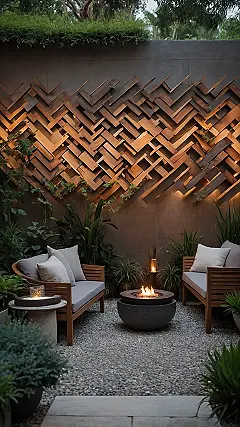 This picture proves you don’t need a sprawling estate to have a seriously cool outdoor hangout. Forget mowing endless lawns; this small garden screams “relax mode activated!” It’s like someone took all the best bits of a fancy resort, shrunk them down, and perfectly placed them in your own backyard. With those comfy chairs, that awesome patterned wall (which probably hides some secret superhero headquarters, just saying), and lush green plants, you might just forget you’re not on a tropical island. Plus, no awkward family photos trying to fit everyone on one bench – just pure, unadulterated chill.