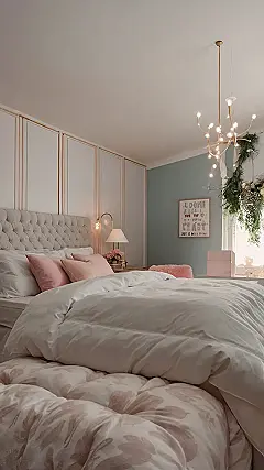 This bedroom is seriously cute! The soft pink walls, comfy-looking bed, and those gorgeous teal accents are totally goals. It’s like a grown-up version of your favorite dollhouse bedroom, but way more chic. The pictures on the wall add a personal touch, making it feel cozy and inviting, not just some fancy hotel room. I bet falling asleep in this dreamy space is easier than passing a pop quiz!