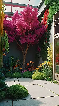 This garden is like something straight out of a fairy tale, but with a whole lot more pink! It’s got a bright pink tree that looks like it’s been dipped in cotton candy, and tons of other colorful flowers to make your eyes sparkle. It almost feels like you could step into the picture and find yourself in a super secret garden, maybe even hidden behind a giant, pink, talking mushroom!