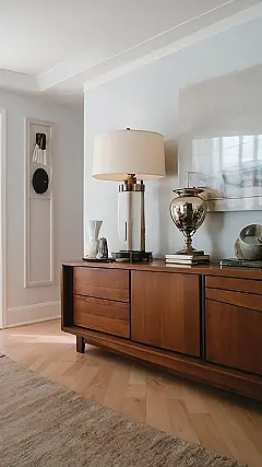 This picture shows a room that’s straight outta a magazine. It’s got that “classy home decor” vibe that everyone wants, but most of us just can’t achieve (without hiring a professional decorator, that is). Look at that beautiful sideboard, it’s just begging for you to place your fanciest books and most expensive looking knick-knacks on top. And don’t even get me started on the lamp. It’s giving serious “I’m a fancy lamp, not a nightlight” vibes. I bet it even comes with its own butler.