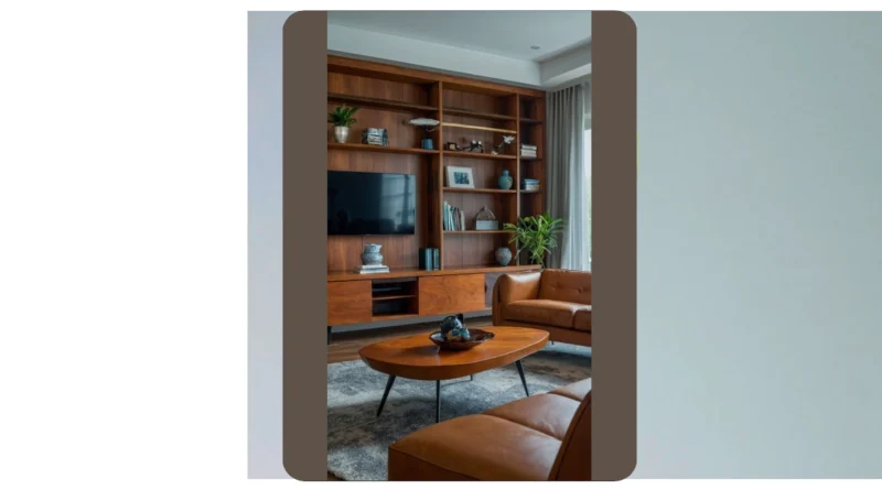 Check out this living room! It’s like stepping back in time to a super cool, retro pad. The wooden furniture is seriously amazing, giving off a cozy and stylish vibe all at once. You could totally imagine binge-watching your favorite shows on that couch, with all your snacks and remotes neatly organized in the shelves. Talk about a perfect study break setup!