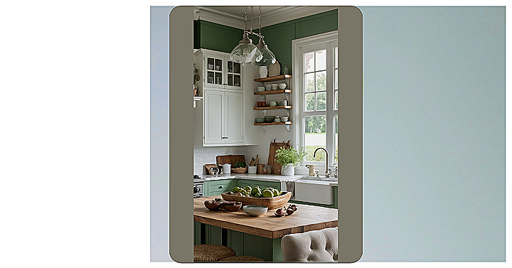 Step into this kitchen retreat where nature’s hues blend seamlessly with culinary creativity. The gentle sunlight filters through the emerald leaves just outside the window, casting a soothing glow over the rustic wooden countertops and verdant accents. Here, the earthy tones of sage green and soft moss colors evoke a sense of calm and tranquility, inviting you to slow down and savor each moment in this serene oasis.