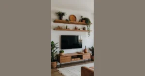 This living room is the ultimate example of trendy home decor done right! It’s like stepping into a magazine spread, with a plush sofa, a huge TV, and a beautiful wooden wall. You could totally imagine relaxing on that comfy couch after a long day, catching up on your favorite show, and maybe even dreaming about the awesome vacation you’ll take someday thanks to all the money you saved by DIYing your own stylish space.