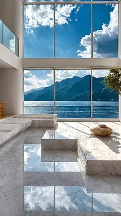 Seeing this room, you might wonder if someone accidentally swapped the ceiling with a giant window, or if you’ve stumbled upon the world’s most reflective floor! Those fluffy white clouds and vast blue sky aren’t just outside; they’re also doing a cool cameo right on the floor. It’s so shiny, you could totally practice your cloud-spotting skills indoors or check if your hair is cooperating without even needing a mirror. Just don’t try to splash in the ‘water’ – it’s solid, we promise!