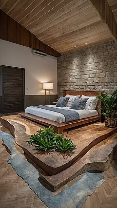 Searching for some wild room inspo that’s definitely not basic? Feast your eyes on this place! It’s got a massive wooden island where the bed chills, looking like a cool slice of a forest just plopped indoors. And get this, there’s even a grey curvy path next to it, almost like a dried-up riverbed, making your floor less “floor” and more “miniature landscape.” Getting into bed probably feels like boarding a ship to dreamland, which is way more fun than just flopping down.