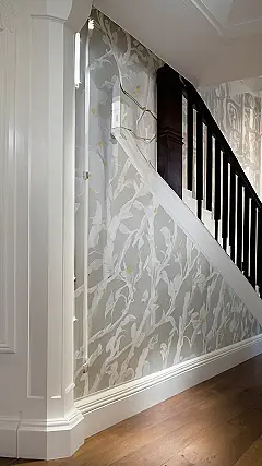 That wallpaper pattern is so cool; it’s like a secret code made of leaves and flowers. I bet if you stare at it long enough, you’ll start seeing hidden staircases to even cooler rooms! Or maybe that’s just me projecting because I really like the cool mix of the wood stairs and the leafy wallpaper.