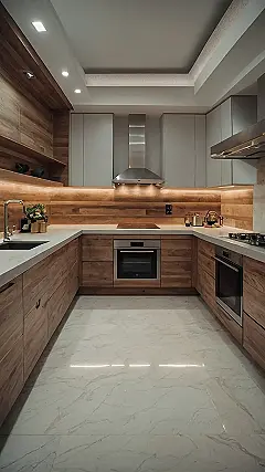 This kitchen is like a dream come true for anyone who loves to cook! With sleek, modern cabinets and a gorgeous marble floor, it feels like something out of a magazine. The wood accents add warmth and a touch of nature, making the whole space feel cozy and inviting. Imagine yourself whipping up delicious meals in this kitchen!