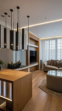Think you need a mansion to have awesome decor? Nope! This room proves you can pack a serious style punch into even the coziest of spaces. It’s like a perfectly organized backpack: everything has its place, and it all looks super cool. From the sleek lights hanging down to the comfy couch begging you to binge-watch your favorite show, it’s small-space living done right.