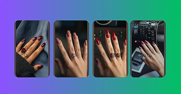 These nails are giving major fall vibes! That gorgeous deep red polish is like the perfect shade of autumn leaves, and it looks absolutely stunning with those sparkly rings. Just imagine walking through a park, all crisp and fall-y, and everyone’s like, “Whoa, check out those nails! They’re totally fall-ready!” You’ll be the trendiest person around, guaranteed.