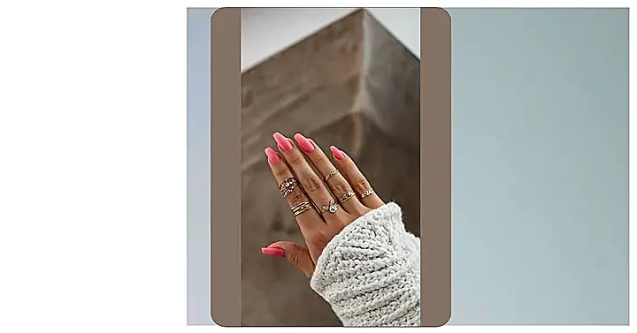 Whoa, check out this hand! These nails are absolutely owning the spotlight with that bold, bubblegum pink. While the latest trends for “short nail designs 2025” might have you thinking tiny tips, these beauties are practically shouting, “Go big or go home!” And let’s not forget the bling – those gold rings are having a full-blown party on every finger, adding extra sparkle. If you’re ever struggling to open a can of soda, at least your hands will look incredibly stylish doing it!