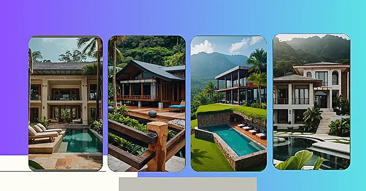 Imagine this: you’re chilling by a sparkling pool, the sun dipping below the horizon, painting the sky in amazing colours. This isn’t just any house; it’s a luxurious tropical villa, straight out of a dream! The picture shows a modern, super-stylish place with huge windows that let you soak in all the stunning views. It’s like the house itself is saying, “Relax! You deserve it!” With its sleek design and comfy-looking furniture, this place is perfect for a super relaxing vacation, whether you’re hanging out with friends or having some quality family time.