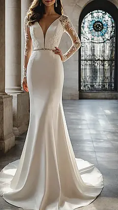 Wow, check out this stunning wedding dress! It’s rocking that fabulous trumpet style, which basically means it hugs you in all the right places before flaring out like a grand musical finale – perfect for making a dramatic entrance, or just looking awesome while you try not to trip. With those intricate lace sleeves and that gorgeous V-neck, you’d feel like absolute royalty, ready to walk down the aisle or maybe even lead a fashion show (just remember to practice your ‘don’t-get-tangled-in-the-train’ walk!).